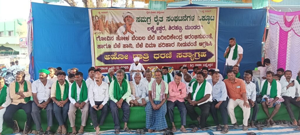 ಲಕ್ಷ್ಮೇಶ್ವರ,:ರೈತರ ಹೆಸರಿನಲ್ಲಿ ಪ್ರಮಾಣ ವಚನ ಸ್ವೀಕರಿಸಿ ಅಧಿಕಾರದ ಗದ್ದುಗೆ ಏರುವ ಸರ್ಕಾರಗಳು ಇದೀಗ ಸಂಕಷ್ಟದಲ್ಲಿರುವ ಗೋವಿನಜೋಳದ ಬೆಂಬಲ ಬೆಲೆ ಖರೀದಿ ಕೇಂದ್ರ ಪ್ರಾರಂಭಿಸಬೇಕು. ಬೆಳೆವಿಮೆ- ಬೆಳೆಹಾನಿ ಪರಿಹಾರ ಕಲ್ಪಿಸಬೇಕು ಎಂದು ಲಕ್ಷ್ಮೇಶ್ವರದಲ್ಲಿ ಸಮಗ್ರ ರೈತ ಹೋರಾಟ ಸಂಘಟನೆಗಳು ಪಕ್ಷಾತೀತವಾಗಿ ಕಳೆದ ೨ ದಿನಗಳಿಂದ ನಡೆಸುತ್ತಿರುವ ಅಹೋರಾತ್ರಿ ಧರಣಿ ಸತ್ಯಾಗ್ರಹಕ್ಕೆ ಅಭೂತಪೂರ್ವ ಬೆಂಬಲ ವ್ಯಕ್ತವಾಗುತ್ತಿದೆ.. .